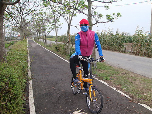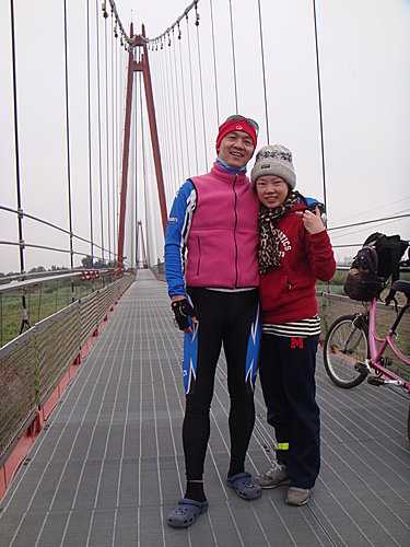 ↑老公穿車衣太冷~穿上我的粉紅背心~還滿配的